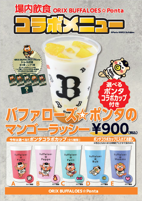 | 商品名 | バファローズ☆ポンタのマンゴーラッシー〔ソフトドリンク〕 【バファローズ☆ポンタコラボカップ入り】 |