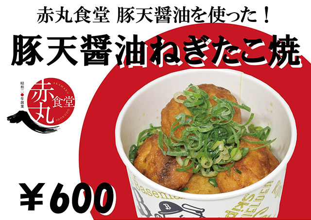 | 商品紹介 | 「赤丸食堂 豚天醤油を使った! ねぎたこ焼き」 ねぎたっぷりの6個入りのたこ焼きに豚天醤油をサッとかけた、 さっぱり食べられる和風なたこ焼きです |