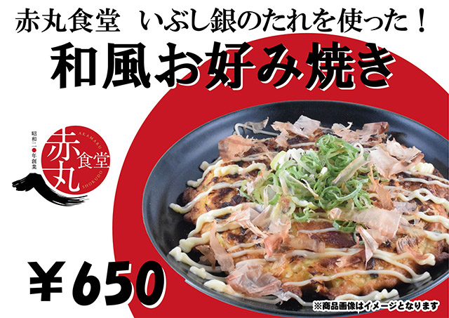 | 商品紹介 | 「赤丸食堂 いぶし銀のたれを使った! 和風お好み焼き」 大阪名物お好み焼きにしょうゆベースのたれのいぶし銀をかけることでスッキリした和風のお好み焼きに仕上げました♪ |