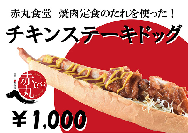 | 商品紹介 | 「赤丸食堂 焼肉定食のたれを使った!チキンステーキドッグ」 チキンステーキを赤丸食堂焼肉定食のたれで味付けました! 赤丸食堂コラボいてまえドッグです♪ |