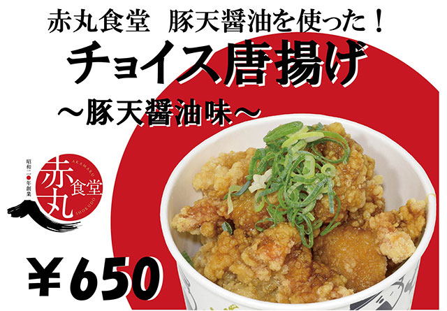 | 商品紹介 | 「赤丸食堂 豚天醤油を使った! チョイス唐揚げ~豚天醤油味~」 豚天醤油と唐揚げの相性は抜群! お店にお立ち寄りの際は、ぜひご賞味ください。 |