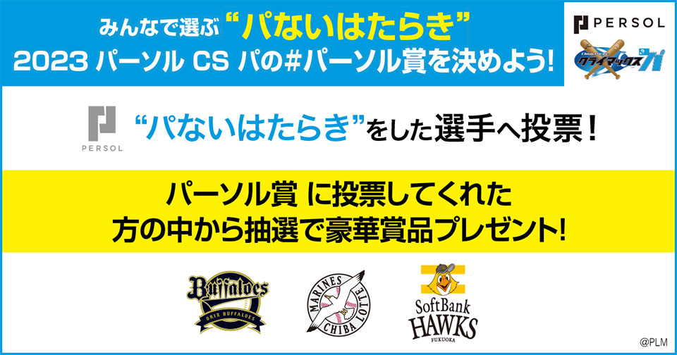 パーソルグループは、2023年度パシフィック・リーグタイトルパートナーとして、「2023 パーソル クライマックスシリーズ パ」期間中、1番“パないはたらき”をした選手に「#パーソル賞」を贈呈いたします。この「#パーソル賞」は、ファンの皆さまから“ハンパじゃないくらいイイはたらき”を略して“パないはたらき”をしたと思う選手へのファンの皆さまの投票で決まります。さらに、キャンペーンに参加いただいたファン皆さまの中から抽選で「2023 パーソル クライマックスシリーズ パ」のパーソル賞得票数上位選手の直筆サイン入りユニフォームや豪華賞品をプレゼントいたします。