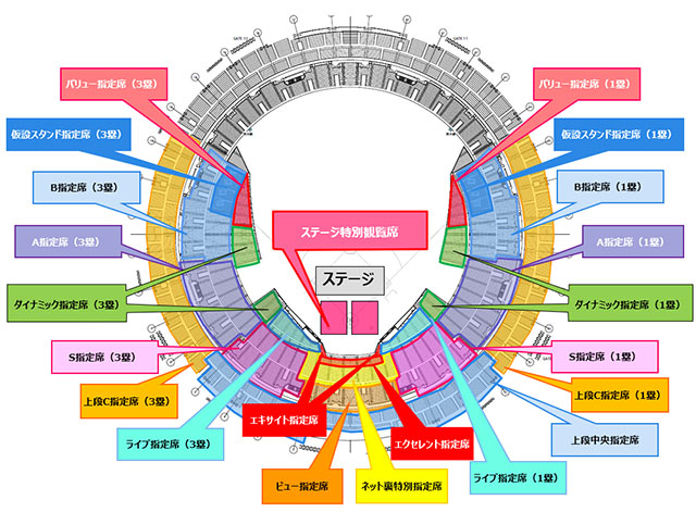 ※(1)「ステージ特別観覧席」は、演出の都合上、開演~30分間はグラウンド内のステージ特別観覧席に通ずる入口を一時利用できません。お早めにご着席ください。