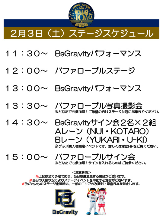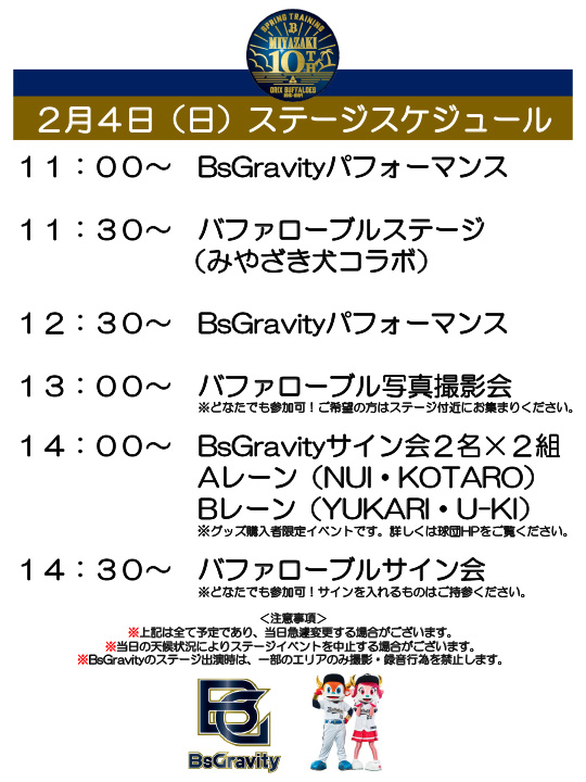 バファローズの宮崎春季キャンプにおいて、マスコット&BsGravityが出演するステージイベントを開催します。是非ご来場ください。