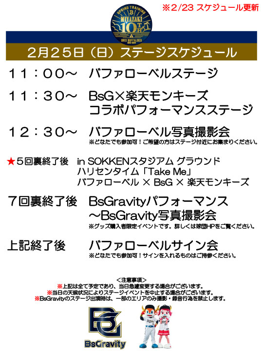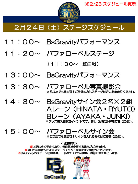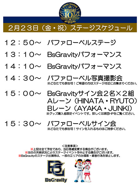 バファローズの宮崎春季キャンプにおいて、マスコット&BsGravityが出演するステージイベントを開催します。ぜひご来場ください。