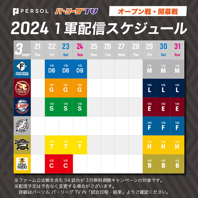 リーグ公式動画配信サービス「パーソル パ・リーグTV」で、2024年3月21日(木)から3月31日(日)の期間において、全ての有料サービスを無料でご利用いただける3月無料視聴キャンペーンを実施いたします。