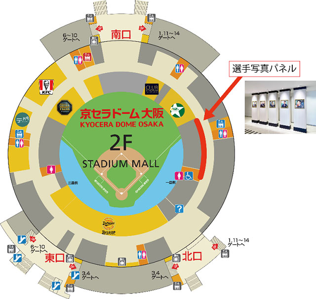 京セラドーム大阪2階スタジアムモール内、北口奥にある通路柱に選手写真パネルが登場! シーズン終了まで全6回パネルの入れ替えを予定しており、第1回目は宮崎キャンプでの笑顔の写真を中心に21選手を掲示しております。 ここでしか見られない選手の写真をぜひご覧ください!