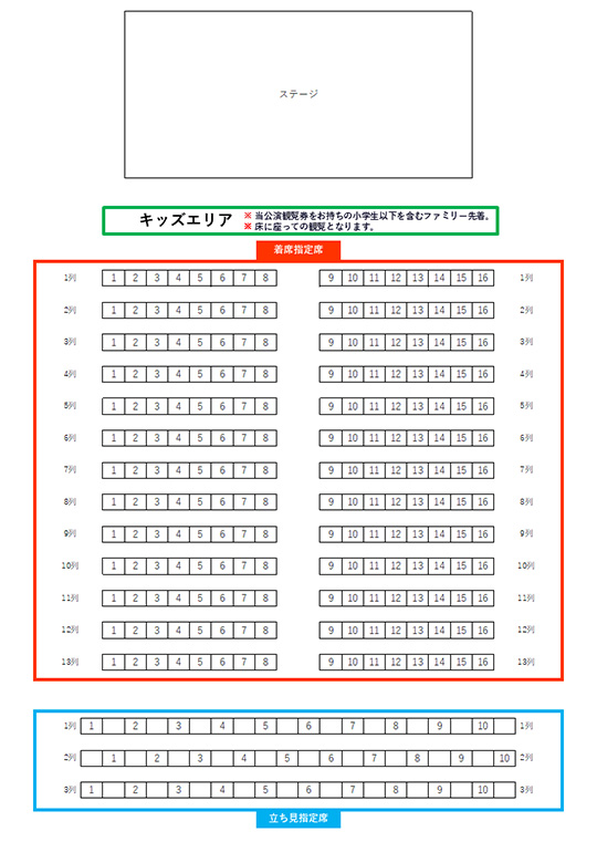 立ち見指定席は、席番ごとに範囲を区切ります。各席の範囲内での撮影・観覧をお願いいたします。立ち見のため椅子のご用意はありません。立ち見指定席3列目のみ、脚立の使用可。(ただし脚立はご持参ください)