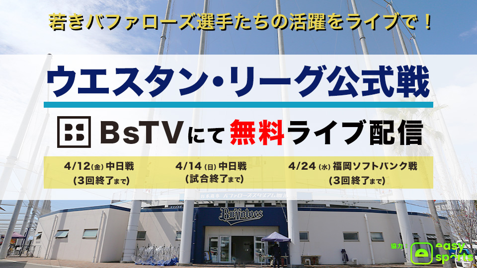 杉本商事バファローズスタジアム舞洲で行われるファーム公式戦を、今シーズンもイージースポーツ協力のもと、球団公式YouTubeチャンネル「BsTV」にてライブ配信いたします!