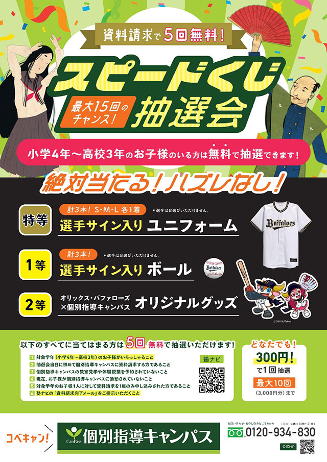 バファローズ選手直筆サイン入りユニフォーム、直筆サイン入りボール、さらに個別指導キャンパス×オリックス・バファローズオリジナルグッズのいずれかが必ず当たります!皆様奮ってご参加ください♪(景品がなくなり次第終了いたします)