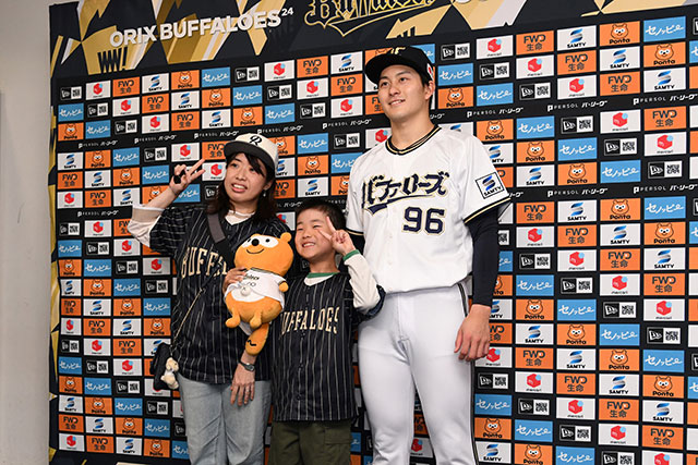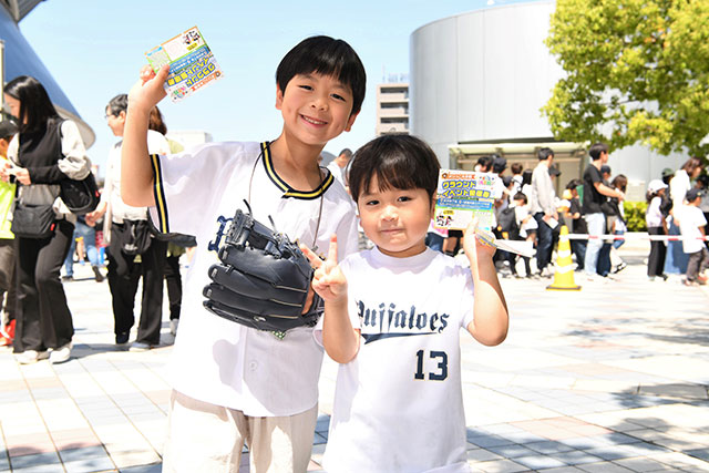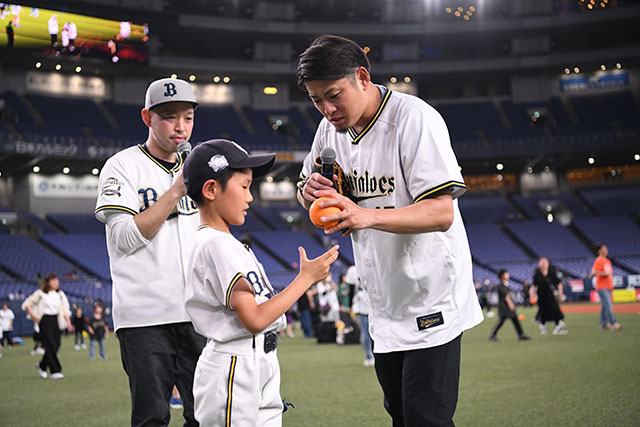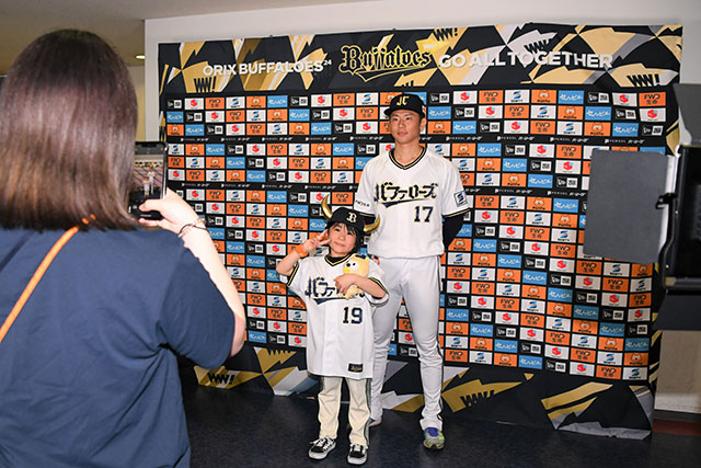 試合前に選手との写真撮影会を行いました。3日(金・祝)は曽谷龍平投手、4日(土・祝)は高島泰都投手、5日(日・祝)は古田島成龍投手が登場。オリっこたちは満面の笑みでポーズを取っていました。
