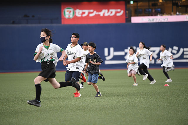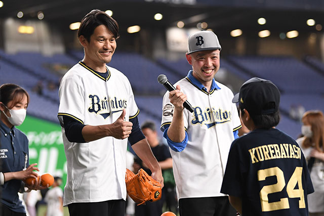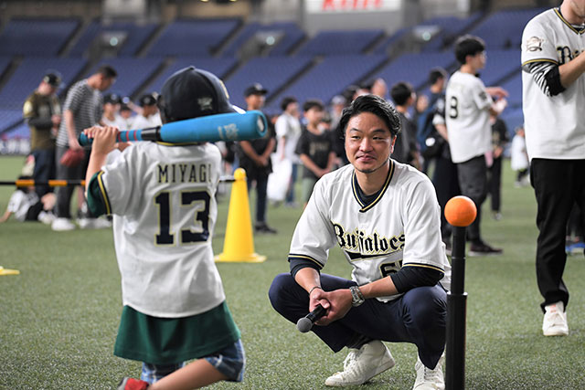 試合後には、元プロ野球選手とのふれあいイベントを開催。3日(金・祝)は坂口智隆さん、4日(土・祝)は海田智行さん、5日(日・祝)近藤一樹さんが登場しました。グラウンドでキャッチボールやティーボールを行い、楽しい時間を過ごしました。