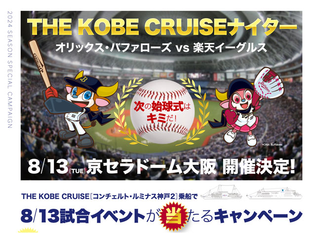 8月13日(火)のオリックス・バファローズvs楽天イーグルス戦は「THE KOBE CRUISEナイター」として開催します。その試合イベントが当たる乗船キャンペーンも同時スタート!