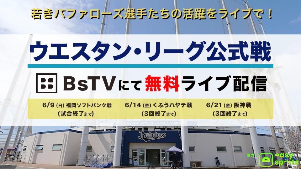 杉本商事バファローズスタジアム舞洲で行われるファーム公式戦を、イージースポーツ協力のもと、球団公式YouTubeチャンネル「BsTV」にてライブ配信!6月の配信日が決まりました。