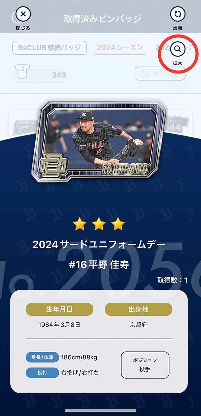 コレクション図鑑のピンバッジを選択いただき、右上の「拡大」を押下するとピンバッジが大きく表示されます!