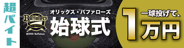 始球式超バイトにて当日就業される方には日給1万円と特典として、2名分の観戦チケットに加え、オリックス・バファローズ選手直筆サイン入りユニフォームをプレゼントいたします。