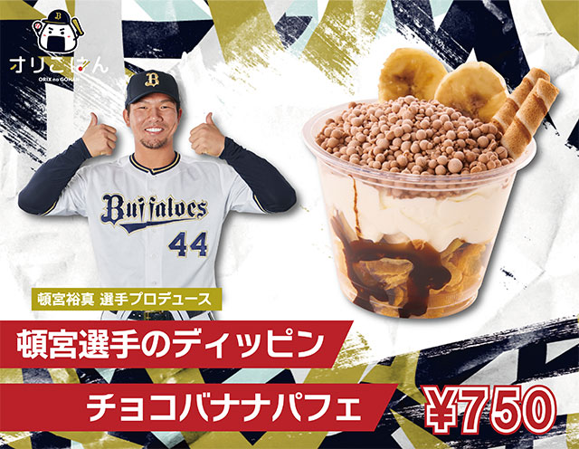 | 商品コメント | 頓宮選手が大好きなフルーツバナナを使ったデザートです。メープルバナナアイスにたっぷりホイップをかけました。 |