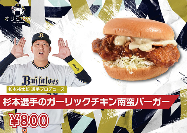 | 商品コメント | 杉本選手が好きなチキン南蛮とガーリックを組み合わせ、男らしいバーガーに仕上げました! |