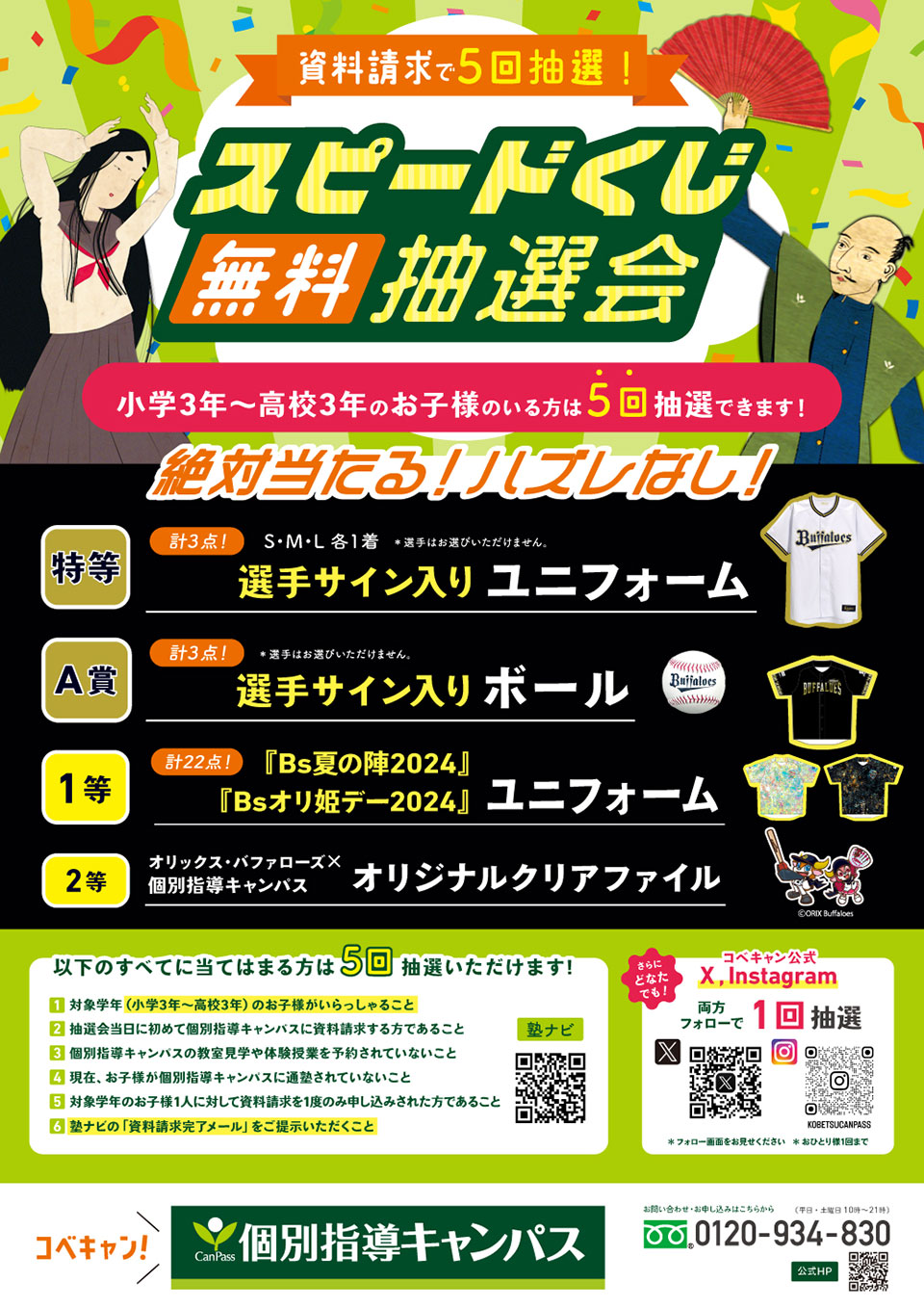 バファローズ選手直筆サイン入りユニフォーム、サインボール、Bs夏の陣2024&Bsオリ姫デー2024ユニフォーム、さらに個別指導キャンパス×オリックス・バファローズ オリジナルクリアファイルのいずれかが必ず当たります!皆様奮ってご参加ください♪(景品がなくなり次第終了いたします)