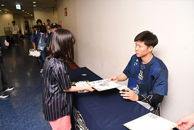 6月16日の試合前には選手のサイン会を開催。曽谷龍平投手、才木海翔投手がオリっこ一人一人に丁寧にサインし、プレゼントしました。