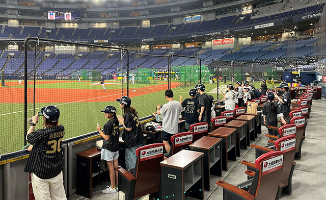 “特等席”の大商大シートで選手の練習を見学。すぐ近くで身体を動かす選手たちを見て、オリっこたちは大喜びでした。