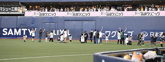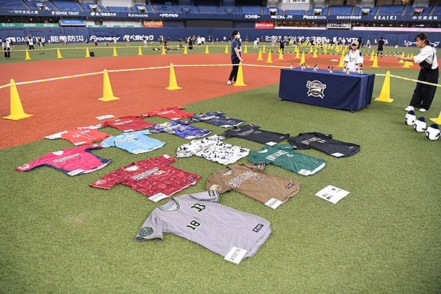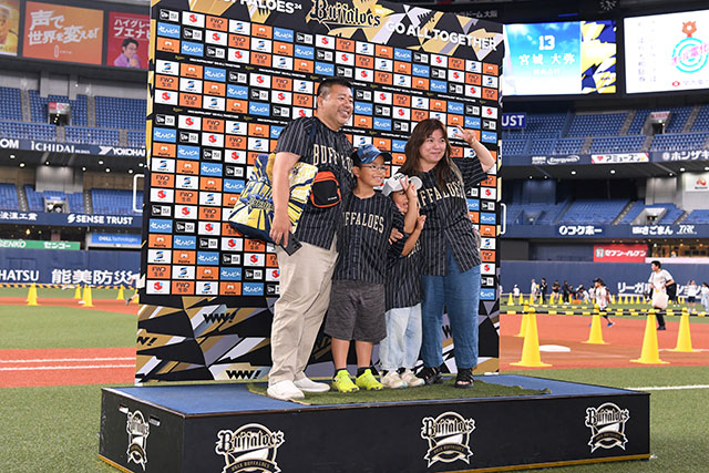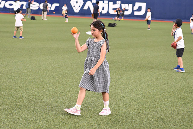 試合後にはオリっこたち向けにグラウンドを開放しました。キャッチボールエリア、記念撮影エリア、フリーエリアの三つのエリアをご用意。家族と一緒に思い思いの時間を過ごしました。