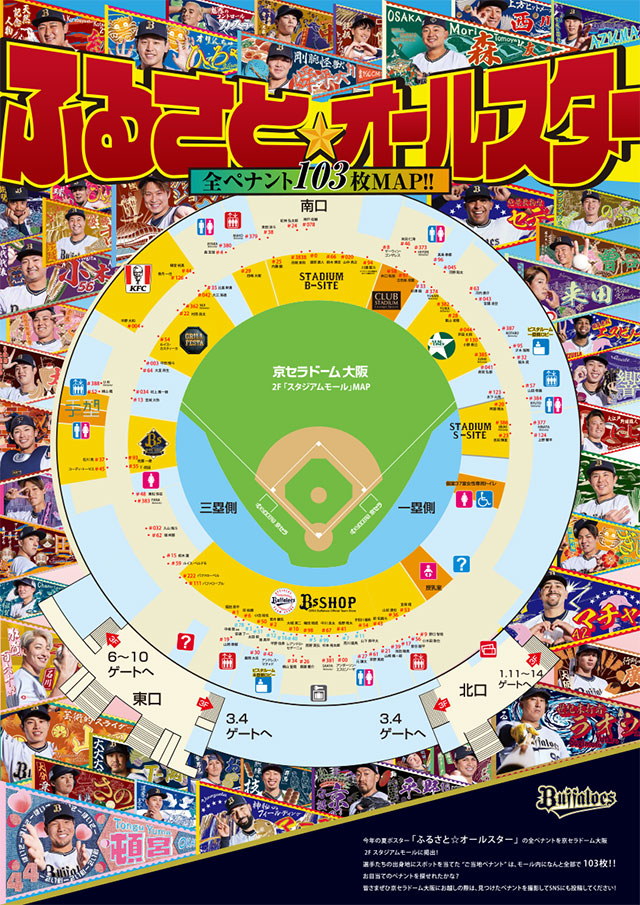 京セラドーム大阪2Fのスタジアムモールに掲出中の「ふるさと☆オールスター」、全ペナント103枚MAPができました! 選手たちの出身地にスポットを当てた「ご当地ペナント」を、モール内ぐるり一周まわって探してくださいね! お目当てのペナントを見つけたら、ぜひ撮影してSNSにも投稿してください!