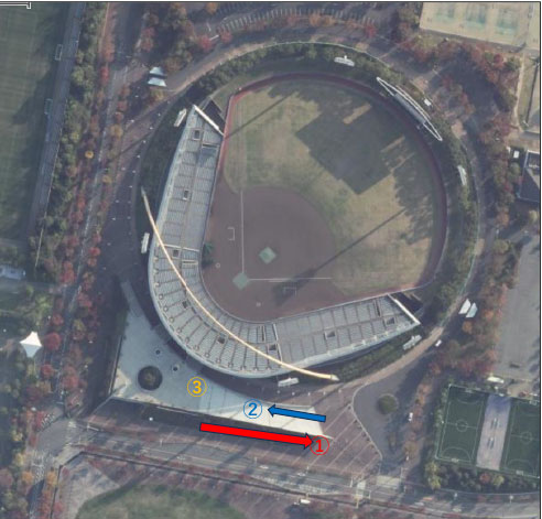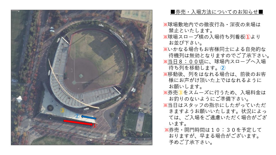 ※当日8:00頃に、球場内スロープへ入場待ち列を移動します。②