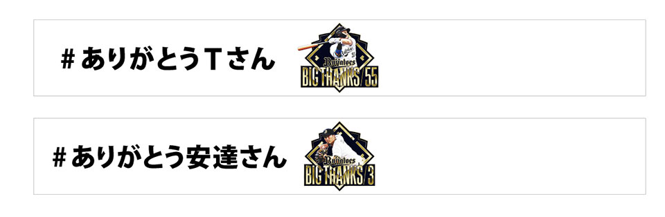 当日ご来場のすべての方に、「T-岡田選手・安達了一選手 応援ボード」を各ゲート入場時に1人につき各1枚ずつ配布いたします。T-岡田選手・安達了一選手登場時や引退セレモニーのときに、みんなで応援ボードを掲げて熱いご声援をお送りください!