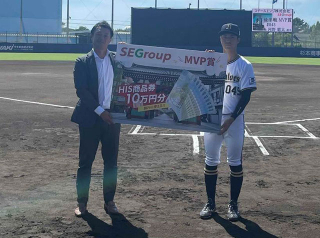 河野選手には、スチールエンジ株式会社よりファーム後半戦MVP賞としてHIS旅行券10万円分が贈られます。