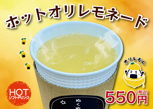 | 商品紹介 | ・ホットオリレモネード オリレモんのシロップを使用したホットレモネード。レモンの酸味とはちみつの甘さが感じられ、身体も“ホッと”温まるドリンクです。 ・ホット抹茶ミルク 抹茶が香る、クリーミーなホットドリンク。スイーツ感覚も感じられる一品です! ・チョコレートコーヒー コーヒーの苦みとチョコレートの甘さがマッチ! 飲みやすいチョコレートコーヒーをご賞味あれ! |