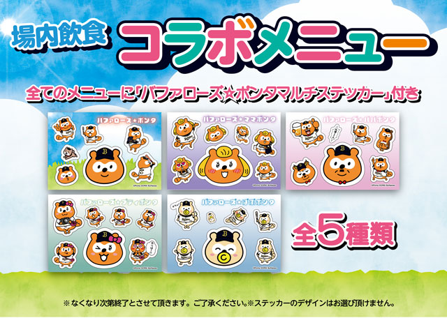 バファローズ☆ポンタコラボメニューを一部リニューアルして販売いたします!各メニューをご購入いただくと、バファローズ☆ポンタマルチステッカー(はがきサイズ)が1枚付いてきます♪ご来場の際は、ぜひ販売店舗にお立ち寄りください。