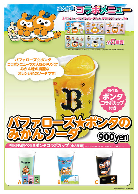 | コメント | バファローズ☆ポンタコラボメニューで大人気のドリンク♪ みかん味の綺麗なオレンジ色のソーダです! バファローズ☆ポンタマルチステッカー付き! |