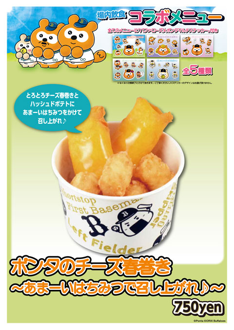 | コメント | とろとろチーズ春巻きとハッシュドポテトにあまーいはちみつをかけて召し上がれ♪ バファローズ☆ポンタマルチステッカー付き! |