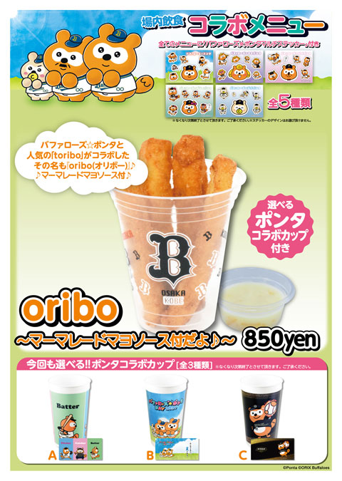 | コメント | バファローズ☆ポンタと人気の「toribo」がコラボしたその名も『oribo(オリボー)』♪ ファンフェスタ限定のマーマレードマヨ付♪ バファローズ☆ポンタマルチステッカー付き! |
