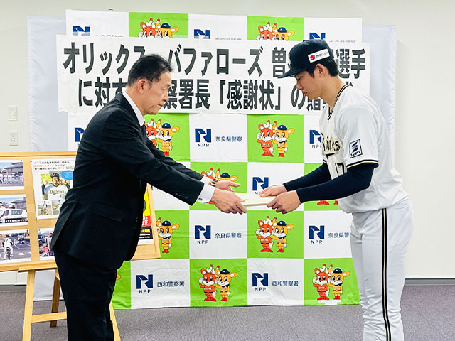 オリックス・バファローズでは1月23日、斑鳩町出身の曽谷龍平投手が交通安全の啓発活動に尽力したとして奈良県西和警察署より感謝状が贈られました。