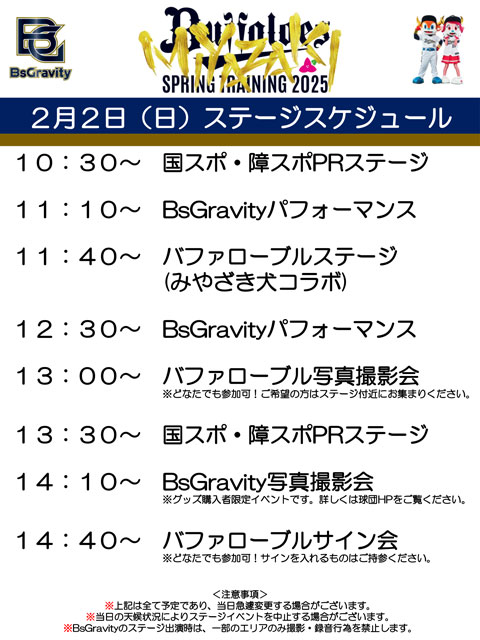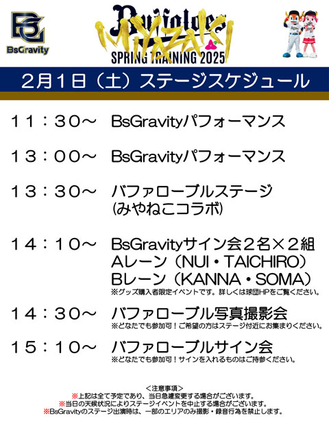 バファローズの宮崎春季キャンプにおいて、2月1日(土)~2日(日)にマスコット&BsGravityが出演するステージイベントを開催します。ぜひご来場ください。