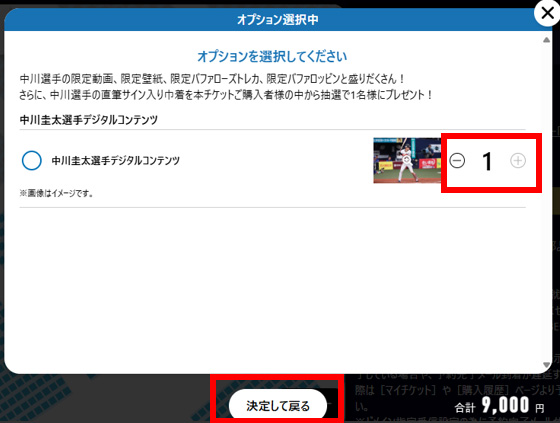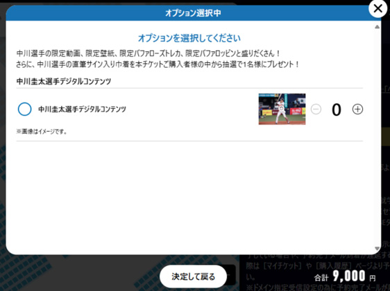 ※ご購入いただけるオプション商品等がない試合もございます。その場合は、オプション商品が選択画面に表示されず、これまで通り、決済・引取方法をご選択後、購入内容確認画面が表示されます。