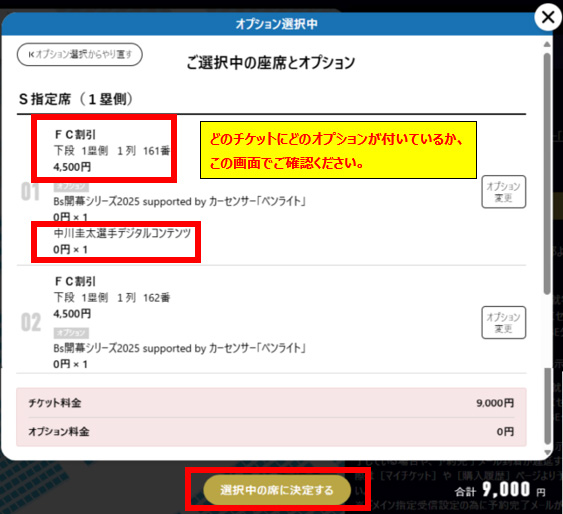(4)チケットにオプションが追加されますので下記ページにて内容をご確認いただき、お間違いなければ「選択中の席に決定する」ボタンをクリックし決済画面へお進みください