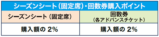 ※法人名義で購入されたシーズンシート(固定席)・回数券(各アドバンスチケット)はポイント付与対象外となります。