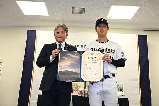 オリックス・バファローズでは3月8日、大阪府羽曳野市出身の太田椋選手が「はびきの応援大使」に就任し、山入端創市長より委嘱状が手渡されました。