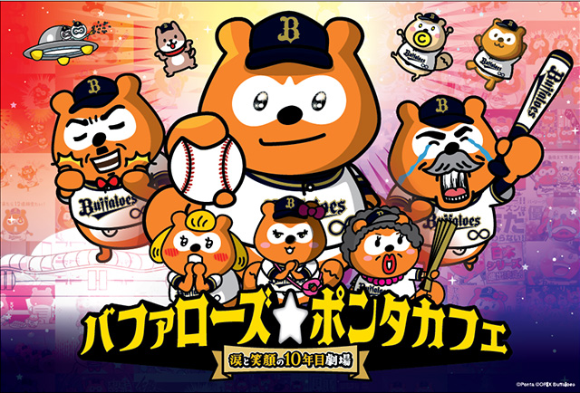 バファローズ☆ポンタがバファローズの応援を始めて、今シーズンで10年目となります。今回のカフェのテーマを「涙と笑顔の10年目劇場」として、試合に負けてしまった時や、3年連続でのリーグ優勝を果たした時など、10年間のさまざまな思い出を振り返るイラストで店内を装飾します。バファローズ☆ポンタで一色となった空間で、オリジナルのコラボメニューをお楽しみいただける他、カフェオリジナルのグッズを販売します。