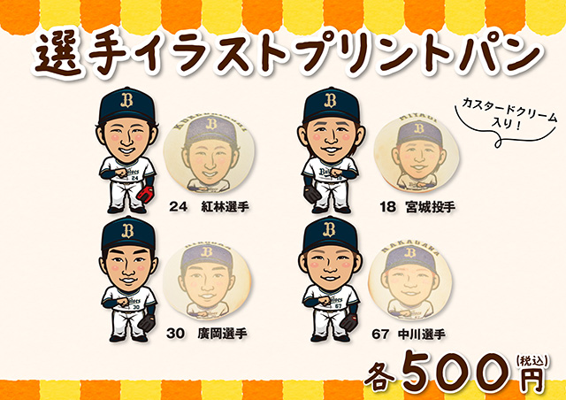 | 商品名 | 選手イラストプリントパン (宮城投手・紅林選手・廣岡選手・中川選手) |