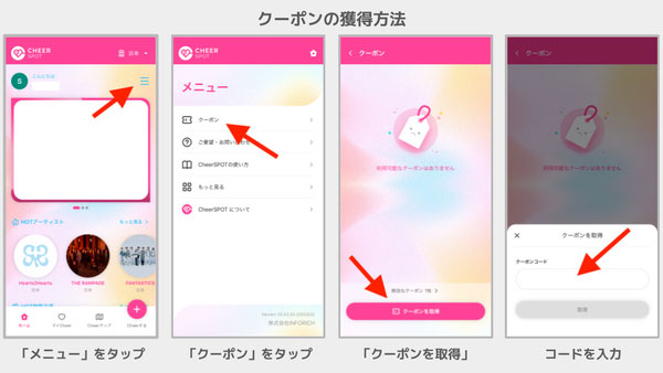 (3)CheerSPOTサービス内で、下図の手順にてクーポンを獲得