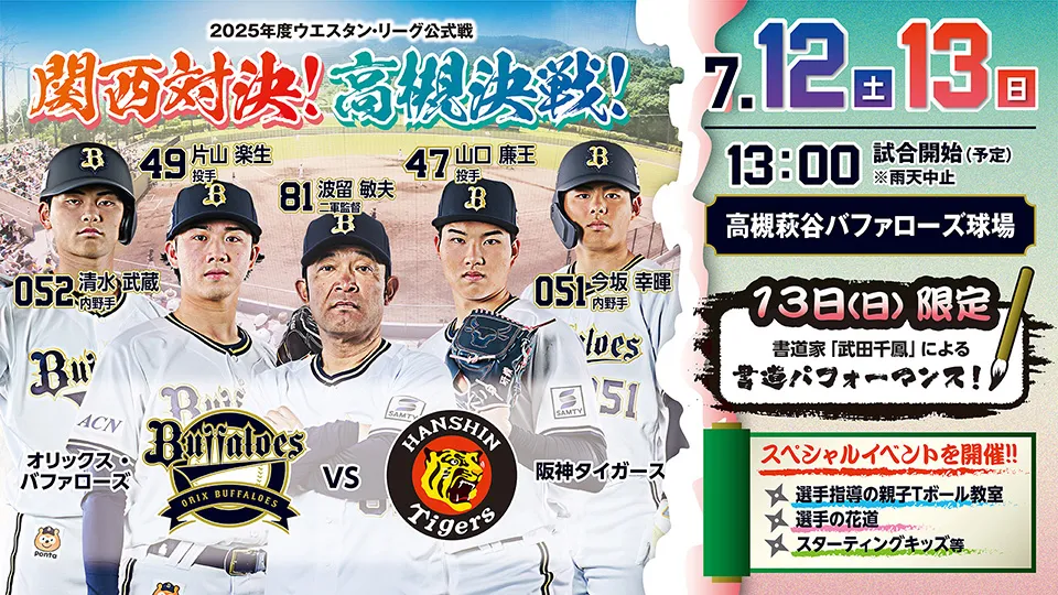 | 日時 | 2025年7月12日(土)・13(日)13:00 試合開始予定 (雨天中止) ※全席自由席 開門 11:00、オンライン予約券売 11:10、一般券売 11:30 |