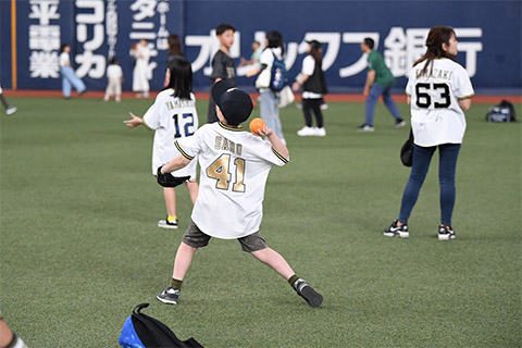 ※記載内容は予定であり予告なく急遽変更する場合がございます。 ※当選された方はキャンセルできません。 ※当選権利を第三者に譲渡することはできません。 ※当選権利を他人に譲渡・転売することは固くお断りいたします。 ※当イベントに参加するための旅費・交通費などは当選された方のご負担になります。 ※当日の試合観戦チケットは各自ご準備ください。(球団にてご用意はありません) ※未就学児のお子様で膝上観戦を予定されている方は、保護者様の当日の試合観戦チケットを確認させていただきます。 ※中止となった場合の振替開催・代替イベントはありません。何卒ご容赦ください。 ※当日球団SNSや他メディアにて当イベントの様子が掲載・放送される場合がございます。予めご了承の上、ご参加ください。 ※運動できる服や靴でご参加ください。 ※グラウンドイベントとなりますので、アクセサリーやヘアピンなどは外していただきますようお願いいたします。また、ヒールやかかとの高い靴ではご入場いただけません。 ※グラウンド内では飲食禁止です。 ※途中退場される場合はお近くのスタッフへお声がけください。 ※周りの方にぶつからないよう十分お気を付けください。 ※本イベントで負傷した場合、応急処置はいたしますが、主催者・球場管理者に帰責事由がある場合を除き、その後の責任は負いません。なお、怪我をされた場合はお近くの係員にお申し出ください。 ※イベント見学をご希望の場合は下段内野スタンドの空席からご覧いただけます。なお、下段外野指定席および上段席は試合終了後閉鎖いたしますので、該当席種でご観戦の場合はご移動をお願いいたします。 |
