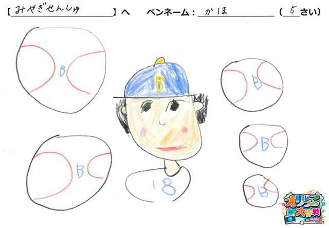 | 賞および特典 | ご応募いただいた方の中から、下記の賞をお贈りします。 ◆めっちゃ似てるで賞◆ 1名 …モデルにめっちゃ似ている作品を描いてくれたオリっこ画伯に贈ります ◆バファローズ愛あふれてるで賞◆ 1名 …バファローズ愛あふれる作品を描いてくれたオリっこ画伯に贈ります ◆のびしろ感じるで賞◆ 1名 …将来性を感じる作品を描いてくれたオリっこ画伯に贈ります 受賞したオリっこ画伯には、「サクラクーピーペンシル24色」(提供:サクラクレパス)に選手の直筆サインをお入れしてお送りします。 |