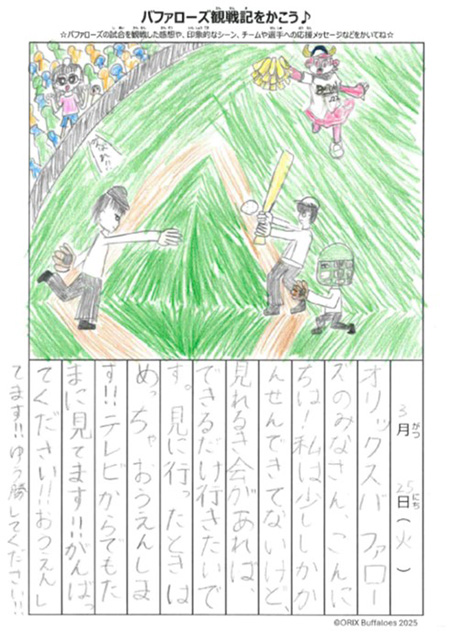 | 参加方法 | 応募用の絵日記用紙にテーマに沿った【絵】と【文章】をかいてください。 6月15日(日)のオリっこ画伯ブースでも用紙をご用意しています。 絵日記テーマ:バファローズ観戦記 6月15日(日)のバファローズ戦を観戦した感想や、印象的なシーン、チームや選手への応援メッセージなど |