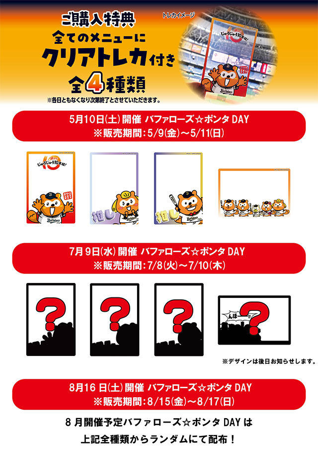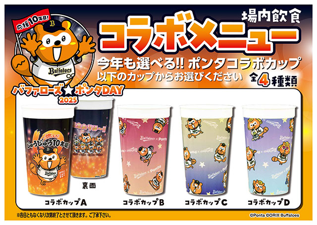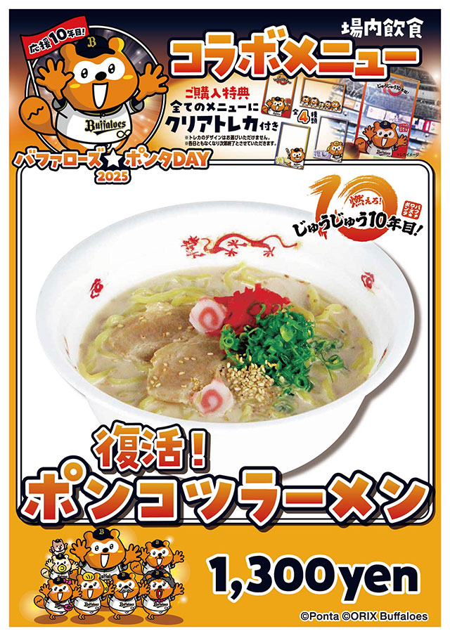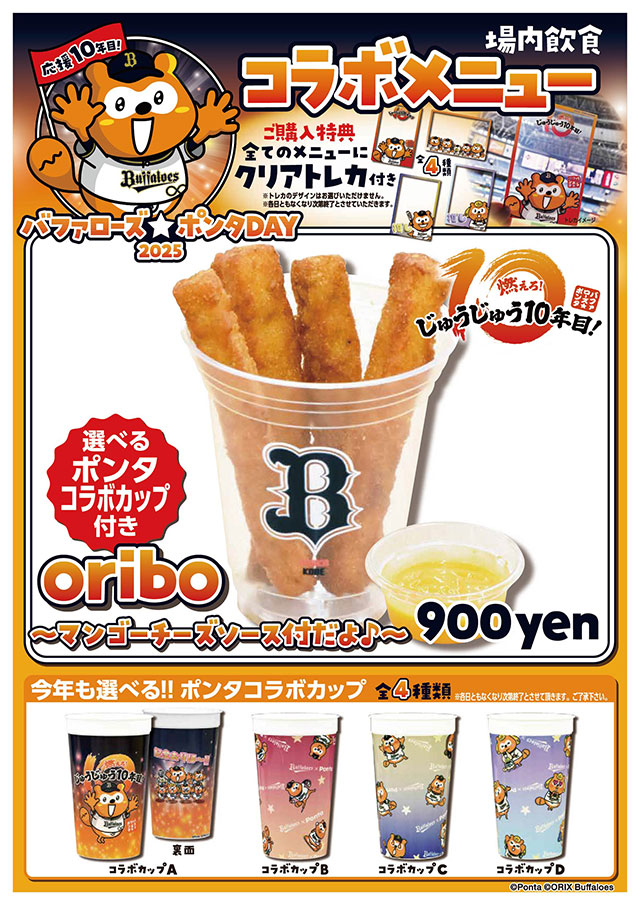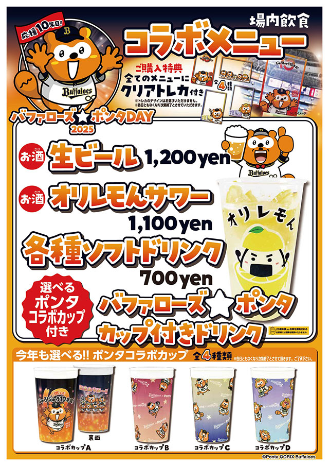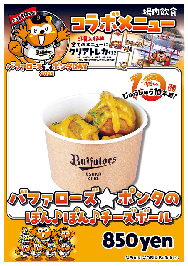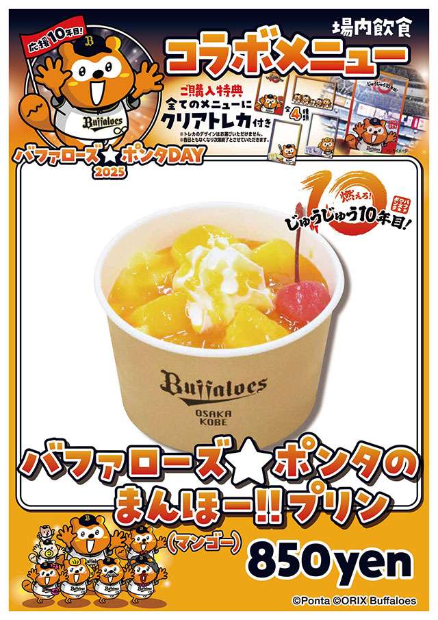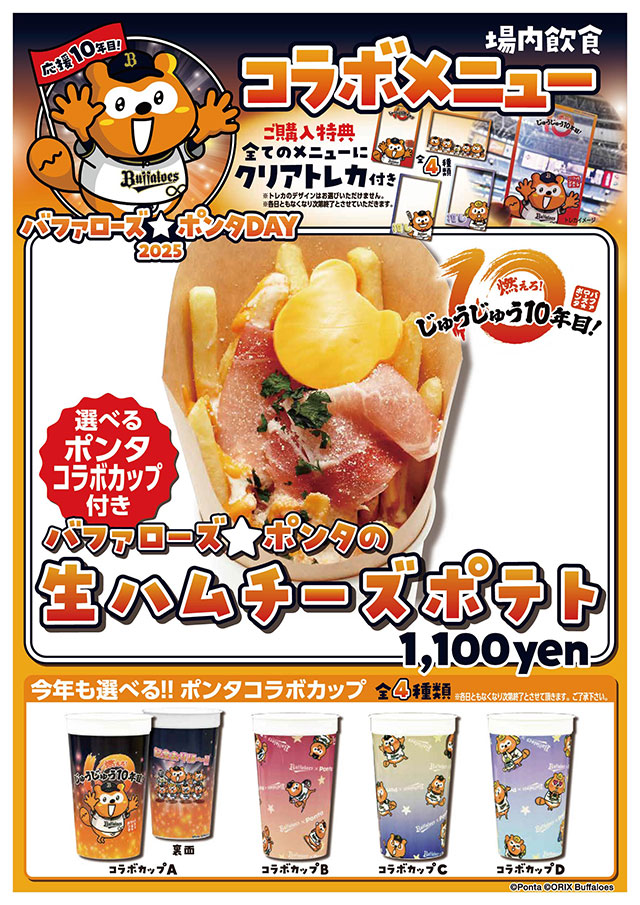 5月10日(土)の「バファローズ☆ポンタDAY 2025」では、今年も場内飲食売店にてバファローズ☆ポンタコラボメニューを販売いたします!
