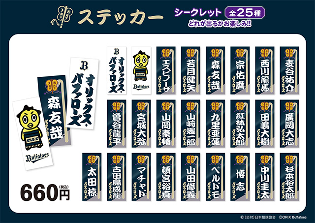 | 種類 | 25種(バファローズ・ひよの山・エスピノーザ・若月・森・宗・西川・麦谷・曽谷・宮城・山岡・山崎颯・九里・紅林・田嶋・廣岡・太田・古田島・マチャド・頓宮・山田・ペルドモ・博志・中川・杉本) |